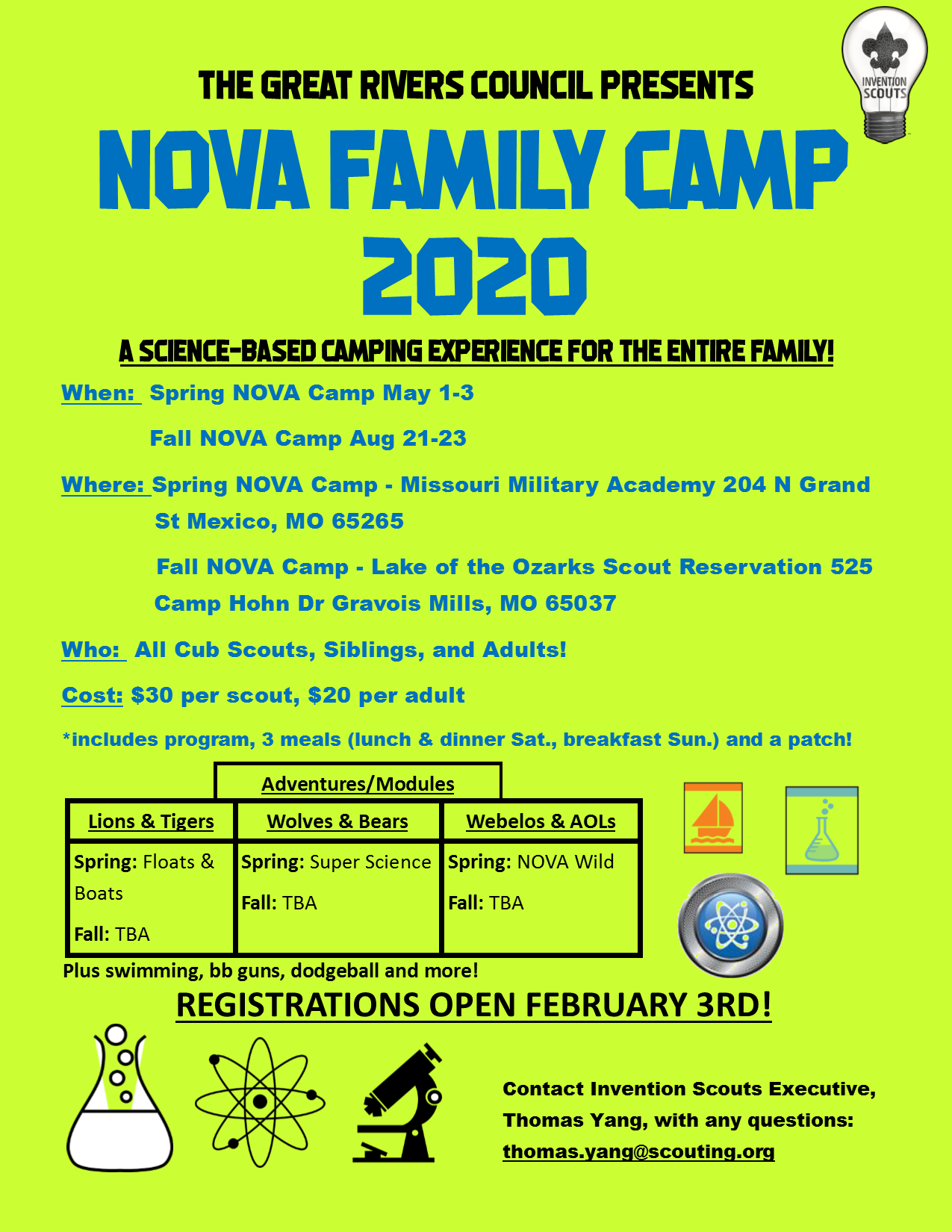 Register for Spring Invention-NOVA Family Camp May 1st-3rd at the Missouri Military Academy! Click here to register today!
